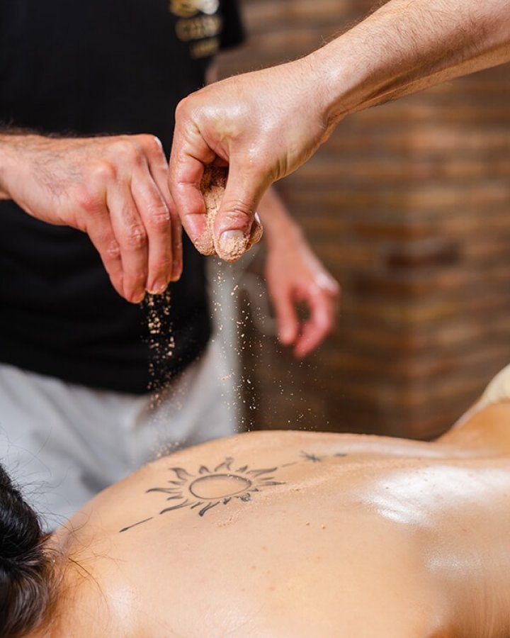 Masaż dynamiczny w połączeniu z mocnym uciskaniem i ugniataniem. Wykonywany jest na bazie proszków ziołowych z dodatkiem mąki z ciecierzycy, jęczmienia i czerwonej glinki. Wspaniale wyrównuje defekty skóry już po pierwszym zabiegu, a po całej serii widoczna redukcja cellulitu i zmniejszenie obwodów ciała.